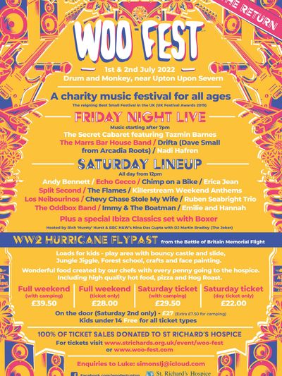 Woo Fest returned for its 5th year of music at the Drum & Monkey in Upton. We raised an incredible £20,404.55 for St Richard‘s Hospice, an astonishing increase from £12.4K the previous year and thanks to all our customers, bands, sponsors and volunteers!